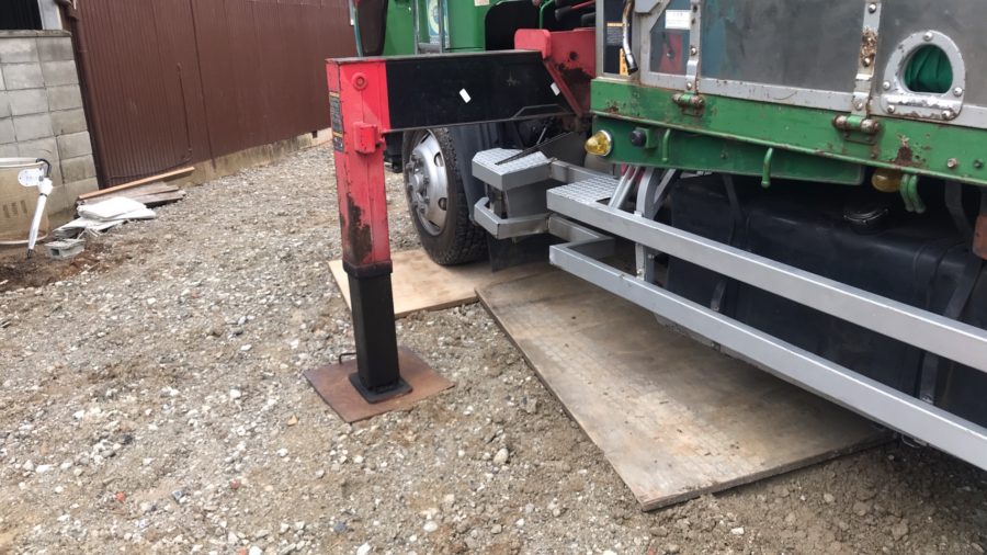 (軟弱地盤ではトラックが転倒してしまうので敷鉄板400mm×400mmを敷きます)